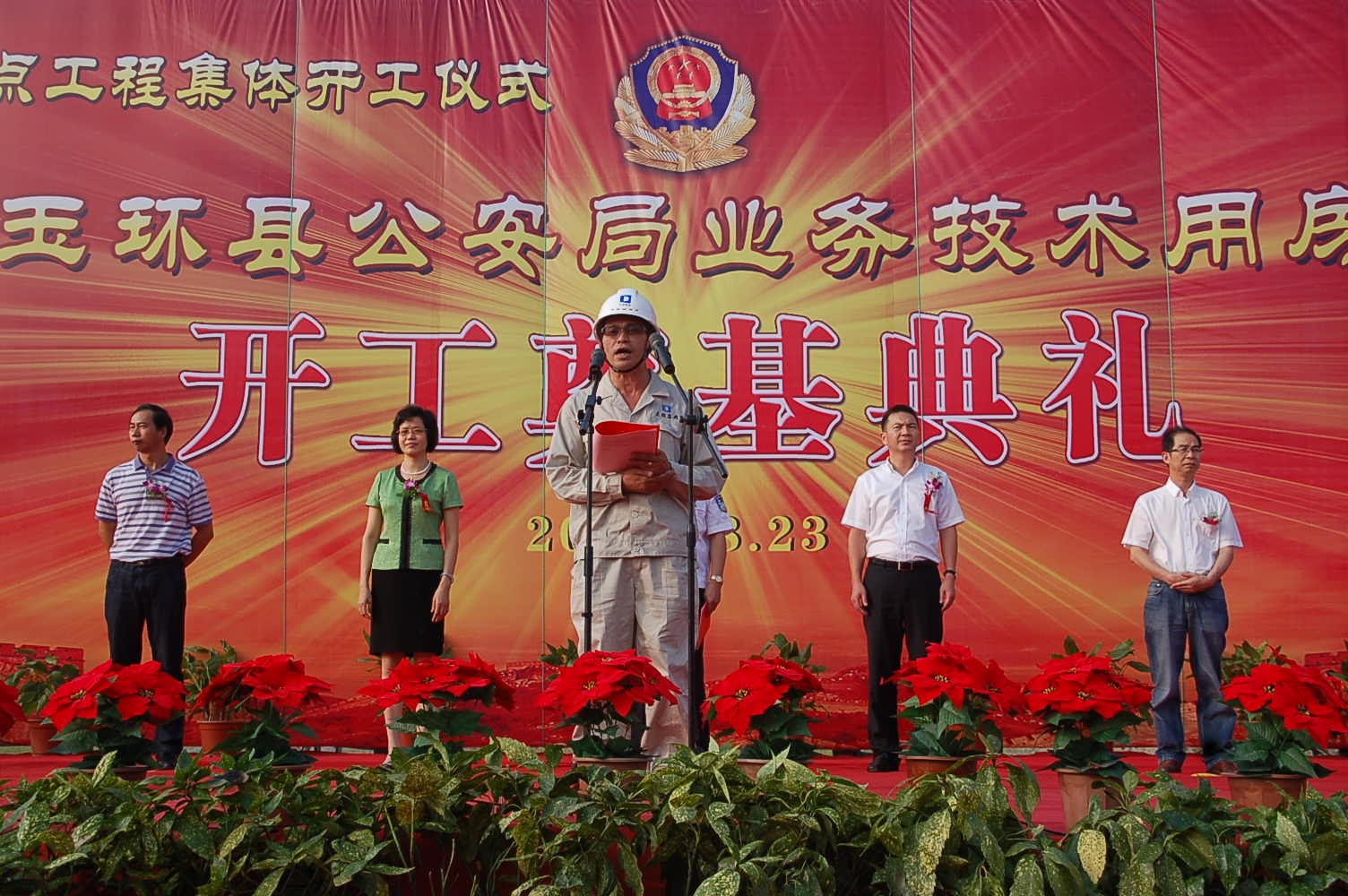 開工奠基典禮由縣委常委、公安局局長沈云才主持。市公安局副局長連吉興、縣委副書記朱立國、縣委常委副縣長張愛光、縣人大副主任許愛平、縣政協副主席陳茂榮、縣委政法委副書記邢文彬、縣公安局政委翁振貴等領導,及集團董事長李建強、總經理胡明、生產副總馮金榮、總經理助理金望哲出席儀式。
