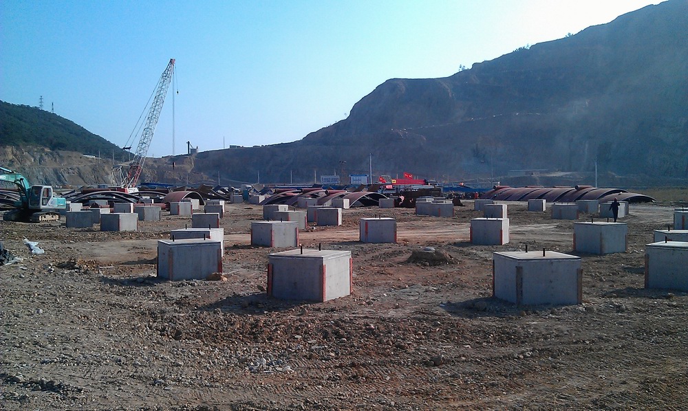 項(xiàng)目部承建的一階段工程位于寧波北侖區(qū)青峙開(kāi)發(fā)區(qū)內(nèi),共有丙烯罐組12個(gè)球罐基礎(chǔ)與混合碳四罐組10個(gè)球罐基礎(chǔ)。其中丙烯罐組每個(gè)罐基礎(chǔ)上均勻分布10個(gè)短柱,混合碳四罐組每個(gè)罐基礎(chǔ)12個(gè)短柱。每只短柱上都預(yù)埋2個(gè)M48地腳螺栓。