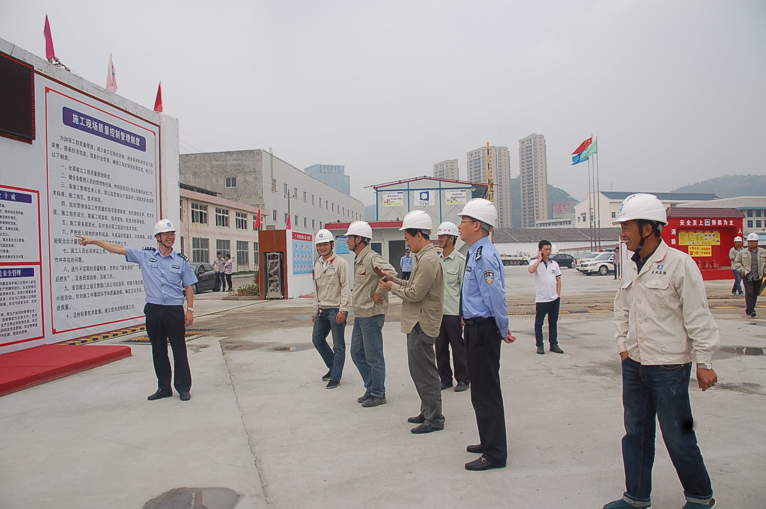 在項目部會議室,縣領導認真聽取了施工單位、監理單位、業主領導關于工程施工的安全、質量、進度、文明施工等情況的匯報,陳縣長對現場的安全措施是否到位、原材料是否合格、施工作業是否規范都一一進行了詢問,得到滿意的答復后,他對現場今后的工作提出幾點要求:1.要求工程的相關單位主動配合、積極協調,嚴把工程安全、質量關,確保施工順利進行;2.嚴格按照國家有關環境污染的法律、法規對現場的粉塵、噪聲進行防治,做到無污染、無投訴;3.加強對民工進行安全教育和政治引導,關心和改善民工生活條件,做好食堂衛生管理,確保民工身體健康。